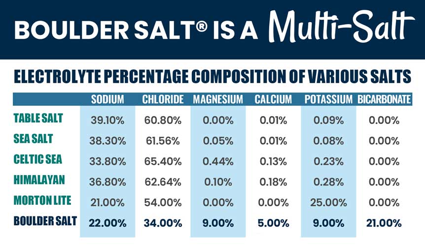 Boulder Salt was crafted by a biochemist who truly understands the body’s need for different minerals. Its balanced levels of sodium, bicarbonate, potassium, magnesium, calcium, and chloride not only make it the best healthy salt but also a potent and ideal source of electrolytes.
